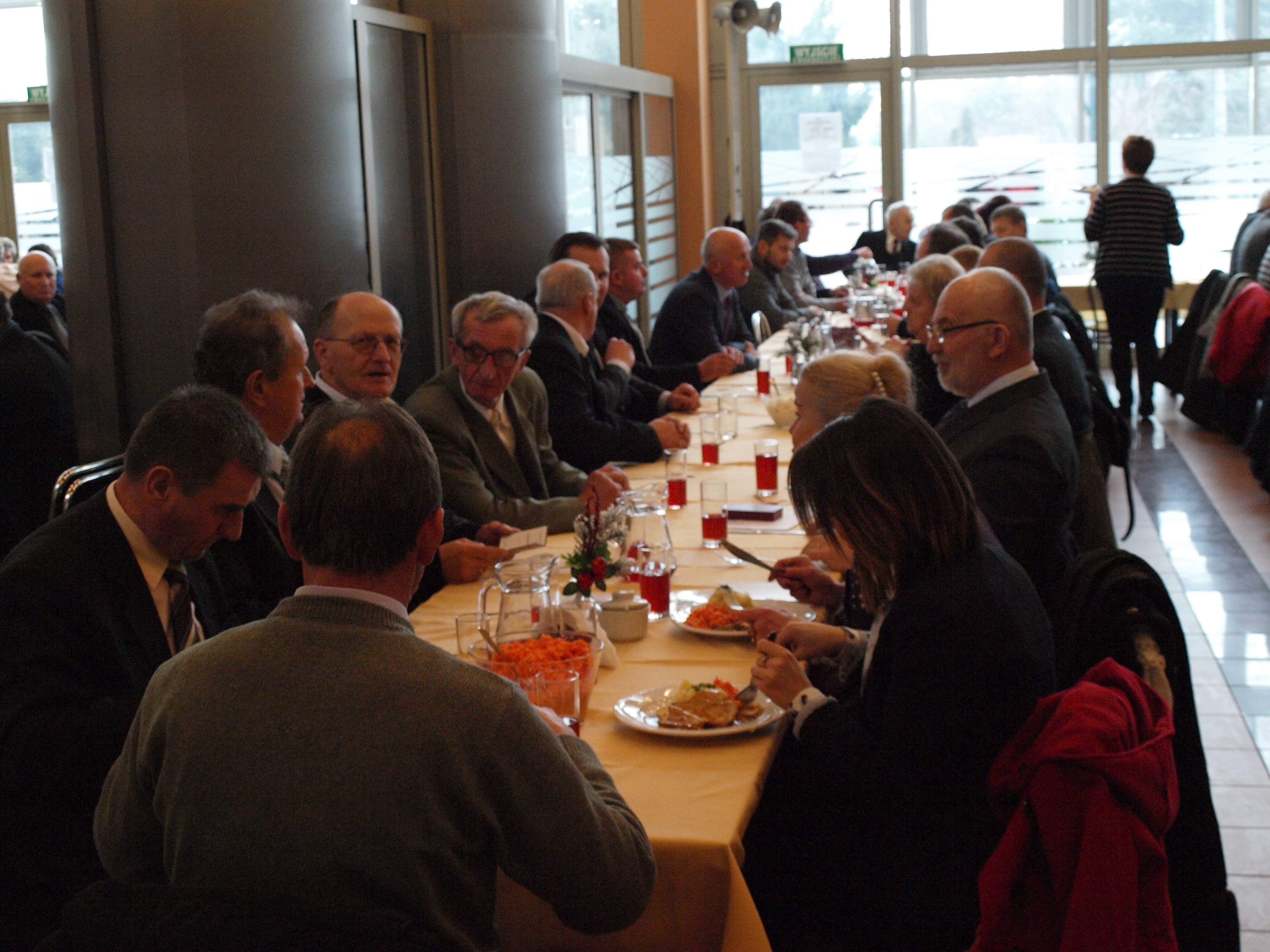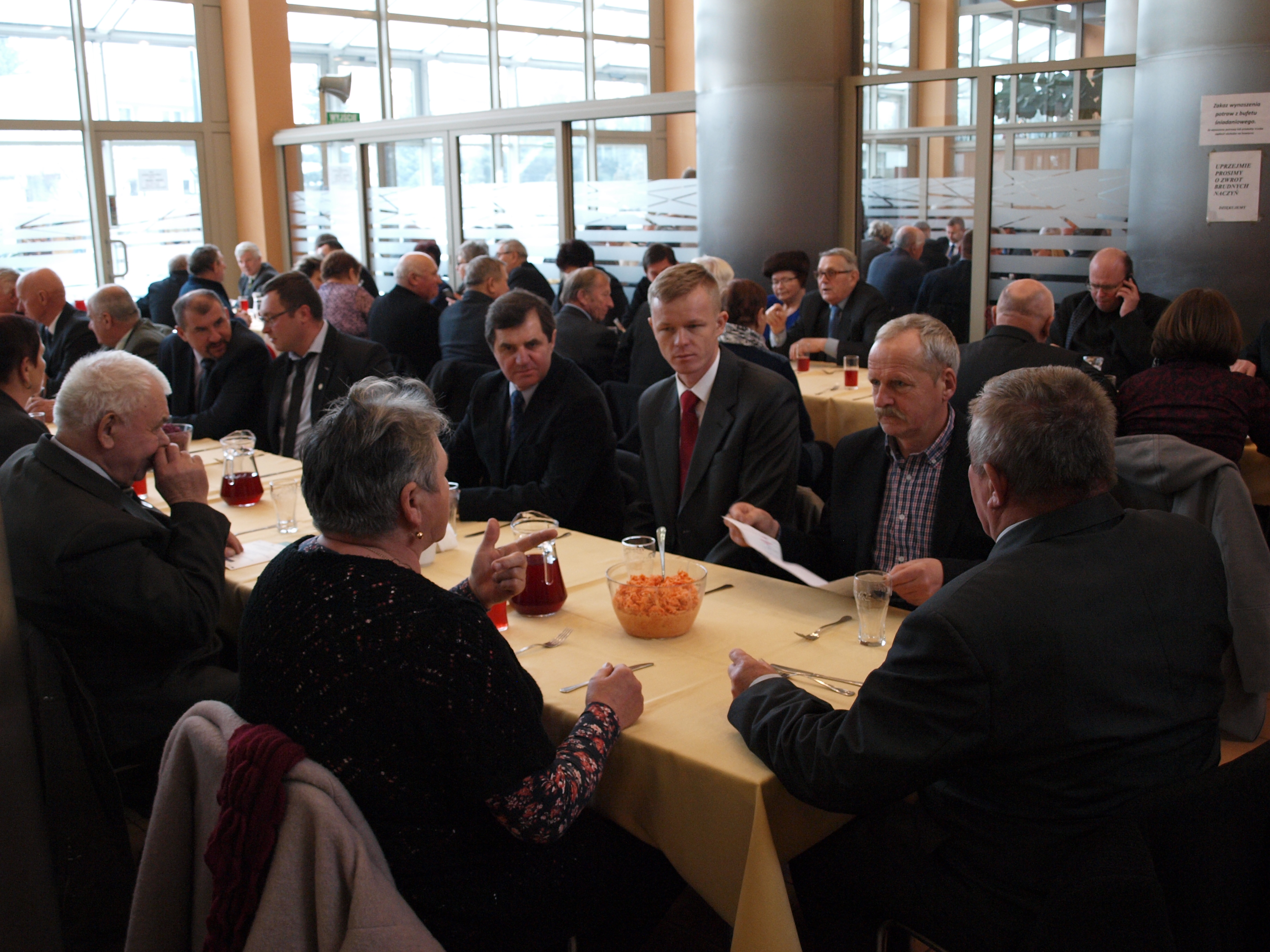 W ostatniej części spotkania głos zabrał Prezes Małopolskiego Stowarzyszenia Sołtysów – Grzegorz Przybyło. „Dziękując wszystkim za obecność, składam najlepsze życzenia noworoczne dla szanownych gości oraz wszystkich koleżanek sołtysek i kolegów sołtysów. Podsumowując ubiegły rok 2016, mogę stwierdzić, że był on dla naszego Stowarzyszenia wyjątkowy. Po kilkuletniej przerwie, organizacja na nowo nabrała rozmachu w swej działalności, aby przede wszystkim dbać o małopolskich sołtysów, a co za tym o nasze małe ojczyzny. W najnowszej historii Stowarzyszenia znalazły się dwa wydarzenia z ubiegłego roku, które istotnie wskazały, że Stowarzyszenie odgrywa ważną rolę nie tylko w województwie małopolskim, ale i w Polsce. Pierwsze z nich miało miejsce w czerwcu 2016, gdzie w partnerstwie z Urzędem Marszałkowskim, Małopolskie Stowarzyszenie Sołtysów zorganizowało Ogólnopolski Zjazd Krajowego Stowarzyszenia Sołtysów. Jego uczestnikami byli delegaci ze stowarzyszeń działających na terenie kraju i zrzeszających sołtysów z całej Polski. Trzeba także wspomnieć o takich inicjatywach jak powrót do podtrzymania tradycji opłatkowej - w styczniu poprzedniego roku odbyło się pierwsze po kilkuletniej przerwie spotkanie opłatkowe. Kolejna z nich to coroczny Konkurs Na Najlepszego Sołtysa Województwa Małopolskiego. Nie można zapomnieć również o drobnych rzeczach jak zwykłe spotkania członków zarządu z sołtysami, wydanie materiałów promocyjnych Stowarzyszenia oraz o pracy wewnątrz naszej Organizacji, które usprawniały jej funkcjonowanie.  Koniec ubiegłego roku przyniósł nawiązanie relacji i współpracy z Wojewódzkim Urzędem Pracy, z ARMIR-em, a także Uniwersytetem Rolniczym. Jeśli chodzi o media należy wymienić tutaj Radio Kraków, gdzie nasi sołtysi mają możliwość opowiedzenia na antenie słuchaczom o swoich miejscowościach, ludziach czy też podejmowanych, innowacyjnych działaniach. W tym miejscu warto podkreślić, że od wielu lat, przede wszystkim, wtedy gdy kondycja naszej Organizacji była trochę gorsza, zawsze wspierał nas Bank BGŻ, a obecnie BGŻ BNP Paribas, w osobie Pana Tadeusza Wójcika. Dzisiaj, serdecznie pragnę podziękować wszystkim osobom i instytucjom, także i tym których tutaj nie wymieniłem, a wspierają nas choćby w najmniejszym zakresie. Obecny 2017 rok jest będzie dla nas czasem szczególnym. Małopolskie Stowarzyszenie Sołtysów będzie obchodzić 25-cio lecie swojego istnienia. Już podjęliśmy działania mające na celu uświetnienie tej rocznicy. Już dziś, w imieniu całego zarządu, wszystkich obecnych na spotkaniu, serdecznie zapraszam na tę dużą uroczystość, która odbędzie się na przełomie miesięcy wrzesień/październik. Podczas tego wydarzenia chcemy docenić wszystkich naszych partnerów, którzy wspierali naszą organizację. Zapraszam ich także do włączenia się w tę uroczystość. Dodam, że będzie to duże wydarzenia z udziałem wielu znamienitych gości, w tym przede wszystkim sołtysów z całej Małopolski. Ten rok to także organizacja Konkurs Na Najlepszego Sołtysa Małopolski, którego rozstrzygnięcie tym razem będzie miało miejsce w Radgoszczy. To również konkurs Wojewódzkiego Urzędu Pracy, skierowany do sołtysów i samorządów wspierających edukację. To także w dalszym ciągu nawiązywanie i odświeżanie relacji z instytucjami i osobami związanymi z małopolską wsią. Ponadto czeka nas praca nad publikacją podsumowującą 25-lecie naszej Organizacji. Cieszy nas również fakt powstania Instytutu Socjologii Wsi na Uniwersytecie Rolniczym, gdyż jest to nauka, której nieodłącznym elementem są i będą sołtysi oraz polska wieś. Nie sposób dziś przewidzieć co dokładnie nas czeka i co jeszcze uda nam się zrealizować. Powyższe plany to założone minimum do wykonania. Jestem pewien, że sprawne funkcjonowanie naszej Organizacji przyczyni się w bezpośredni sposób do efektywnego wspierania sołtysów z całej Małopolski i rozwoju małopolskiej wsi.” Kolejnym elementem spotkania było połamanie się opłatkiem i złożenia sobie życzeń przez obecnych sołtysów i zgromadzonych gości. Po czym wszyscy zostali zaproszeni na wspólny obiad.